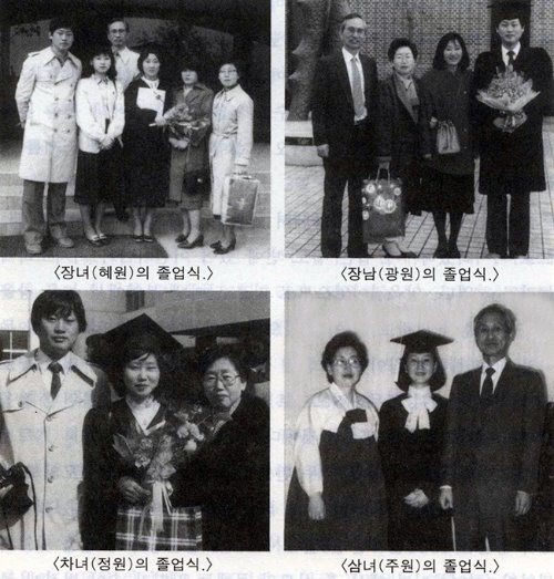¿ì¸® ºÎºÎ´Â ¾ÆÀ̵éÀ» °øºÎÇ϶ó°í À¹¹ÚÁú·¯ º» ÀûÀÌ ¾ø´Ù. ½Ã³» ¹°ÀÌ È帣µíÀÌ ÀÚ¿¬½º·´°Ô Çб³ ±³À°¿¡ ¸Ã°Ü ³õ¾Ò´Ù. ´ÙÇàÈ÷ ¾ÆÀ̵éÀº ½º½º·Î ¾Ë¾Æ¼ °øºÎÇÏ¿´°í, Å©°Ô µÚÁöÁö ¾Ê°í ±³À°ÀÌ ÀÌ·ç¾îÁ³´Ù. Çý¿øÀº Çý¿ø¿©Áß・°í¸¦ ³ª¿Í µ¿´ö¿©´ë¿¡¼ ¹Ì¼úÀ» Àü°øÇÏ¿´°í, Á¤¿øÀº ¼Û°î¿©Áß°ú °æ±â¿©°í¸¦ Á¹¾÷ÇÏ¿© ÇѾç´ë¿Í µ¿ ´ëÇпø¿¡¼ À½¾Ç(ÀÛ°î)À» Àü°øÇßÀ¸¸ç, ±¤¿øÀº Å´ÉÁß°ú µ¿´ëºÎ°í¸¦ ³ª¿Í ¼º±Õ°ü´ë¿¡¼ °øÇÐÀ» Àü°øÇÏ°í °°Àº ´ëÇпø¿¡¼ ±â°è°øÇÐÀ¸·Î ¹Ú»çÇÐÀ§¸¦ ¹Þ¾Ò°í, ÁÖ¿øÀº Çý¿ø¿©Áß․°í¸¦ Á¹¾÷Çϰí ÀÌÈ¿©´ë¿Í ¼¿ï´ë ´ëÇпø¿¡¼ »ý¹°ÇÐÀ» Àü°øÇϰí ÇöÀç ¹Ì±¹ Ä÷³ºñ¾Æ´ë¿¡¼ °æ¿µÇм®»ç(MBA) °úÁ¤À» ¼öÇÐÇß´Ù.