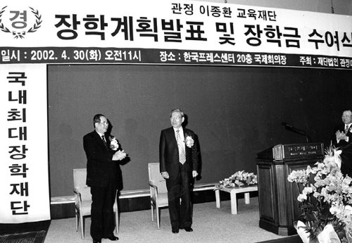 °üÁ¤±³À°Àç´ÜÀÇ ÀåÇаèȹ ¹ßÇ¥¿Í ù ¹øÂ° ÀåÇÐ±Ý ¼ö¿©½ÄÀÌ ÀÖ´ø 2002³â 4¿ù 30ÀÏ ¿ÀÀü 11½Ã, ³ª´Â °³È¸½Ã°£À» ¸î ºÐ ¾ÕµÎ°í ½ÄÀåÀÎ ¼¿ï ÅÂÆò·Î¿¡ ÀÖ´Â Çѱ¹ÇÁ·¹½º¼¾ÅÍ 20Ãþ ±¹Á¦È¸ÀÇÀå¿¡ µé¾î¼¹´Ù. Çà»çÀå¿¡´Â Á¦1±â °üÁ¤ÀåÇлý 263¸í°ú Çкθð, Àü±¹ 26°³ ÀåÇÐ ´ë»ó ´ëÇÐÀÇ ÀϺΠÃÑÀå°ú ÇлýóÀåÀ» ºñ·ÔÇÑ ÀåÇÐ °ü°èÀÚµé, »ï¿µÈÇб׷ì ÀÓÁ÷¿ø°ú ³ªÀÇ Ä£Áöµé ±×¸®°í ÃëÀçÁøµé·Î °¡µæ Â÷ ÀÖ¾ú´Ù. ³»°¡ ´Ü»óÀ¸·Î ³ª¾Æ°¡´Â µµÁß ´ëºÎºÐÀÇ »ç¶÷µéÀº ³»°¡ ´©±ºÁö ¾Ë¾Æº¸Áö ¸øÇÏ´Â °Í °°¾Ò´Ù. ´Ü»ó À§¿¡´Â ¾Æ·¡¿Í °°Àº ÇöÆÇÀÌ °É·Á ÀÖ¾ú´Ù.