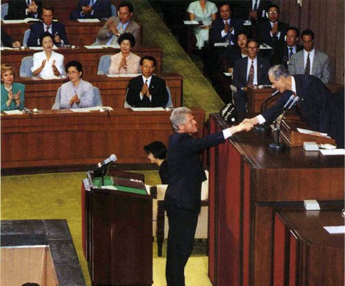 | ¡ã 1993³â 7¿ù ±¹È¸¸¦ ¹æ¹®ÇÏ°í ¿¬¼³À» ³¡³½ Ŭ¸°ÅÏ ¹Ì±¹´ëÅç·ÉÀÌ ÀÇÀå¼®ÀÇ ÀúÀÚ¿Í ¾Ç¼ö¸¦ ¾Æ°í ÀÖ´Ù |