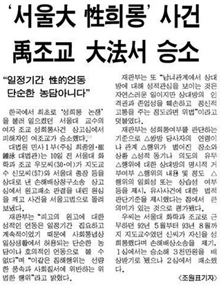 ¿ì Á¶±³ ¼ºÈñ·Õ »ç°ÇÀº ¿ø°í°¡ ÀÓ±â 1³âÀÇ À¯±ÞÁ¶±³·Î ÇÇ¿ëµÇ¾î ±Ù¹«ÇÏ´ø µµÁß Çаú ¼Ò¼Ó ±³¼öÀÎ Çǰí·ÎºÎÅÍ ÀÏÁ¤±â°£µ¿¾È ¿©·¯ ÇüÅÂÀÇ ¼ºÀû ±«·ÓÈûÀ» ¹Þ¾ÒÀ¸¸ç, ±× ¼ºÀûÁ¢±Ù¿¡ ÀÀÇÏÁö ¾Æ´ÏÇÏÀÚ ¿ø°í¸¦ ÀçÀÓ¿ëÇÏÁö ¾Æ´ÏÇϰí ÇØ°íÇÔÀ¸·Î½á ¿ø°í´Â ÀÌ·Î ÀÎÇÏ¿© ÇÁ¶óÀ̹ö½Ã¿Í ¼ºÀû ÀÚÀ¯ ¹× ÀÏÇÒ ±Ç¸®¸¦ Ä§ÇØ´çÇß´Ù°í ÇÏ¿© ±³¼ö¿Í ±¹°¡¸¦ »ó´ë·Î 5õ¸¸ ¿øÀÇ ¼ÕÇØ¹è»óÀ» û±¸ÇÑ »ç°ÇÀÌ´Ù.
