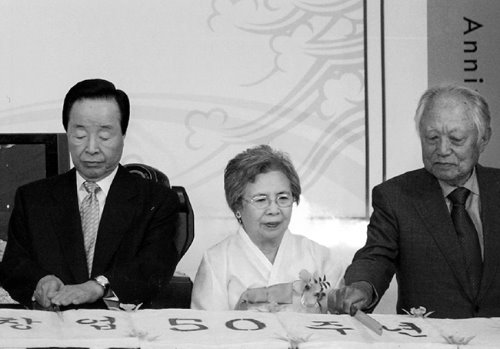 | ¡ã 2008³â 5¿ù 13ÀÏ »ï¿µÈÇРâ¾÷ 50ÁÖ³â ¹× ÀÚ¼Àü Ãâ°£ ±â³ä½Ä¿¡¼ ÃàÇ϶±À» ÀÚ¸£°í ÀÖ´Ù / ¿ÞÂʺÎÅÍ ±è¿µ»ï Àü ´ëÅë·É, ¾Æ³», ±èÀç¼ø Àü ±¹È¸ÀÇÀå |