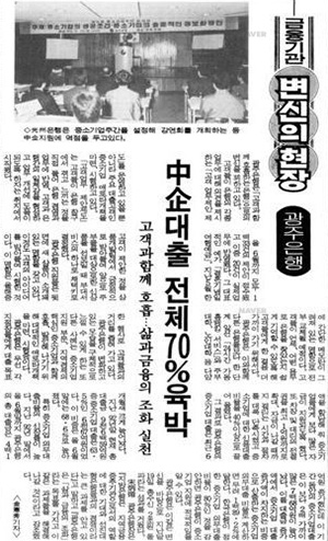 ÀÌ·¯ÇÑ ¿ì¸®µéÀÇ Ã¶ÀúÇÑ ÀÚ±¸³ë·ÂÀº ¼¼°èÀûÀ¸·Îµµ ÁÖ¸ñÀ» ¹Þ¾Ò´Âµ¥, ¿µ±¹ÀÇ ¼¼°èÀûÀÎ ±ÝÀ¶Àü¹® Àϰ£Áö ¡´ÆÄÀ̳½¼È ŸÀÓ(Financial Time)¡µÁö 1991³â 1¿ù 23ÀÏÀÚ¿¡¼´Â ¡®±¤ÁÖÀºÇàÀ» ¹è¿ì¶ó¡¯¶ó´Â ±â»ç°¡ ´ë¼Æ¯ÇʵDZ⵵ Çß´Ù. ±× ½Å¹®¿¡¼´Â ´ç½Ã ±Ø½ÉÇÑ ´ëÃâ ¼Õ½ÇÀ» °Þ°í ÀÖ´Â ¿µ±¹ÀÇ °áÀç ÀºÇà »ç¶÷µé¿¡°Ô ±¤ÁÖÀºÇàÀÇ »ç·Ê¸¦ ±³°ú¼ÀûÀÎ »ç·Ê¶ó°í ¼Ò°³ÇÏ¸é¼ ¸ð¹üÀ¸·Î »ïÀ» °ÍÀ» ±ÇÀ¯Çß´Ù.