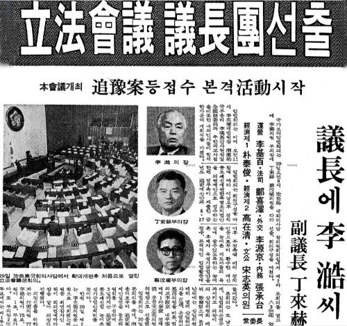 | ¡ã ÀüµÎȯ ½Å±ººÎ°¡ ±¹È¸¸¦ ÇØ»êÇϰí ÀÔ¹ýºÎ¸¦ ´ëüÇÒ ±â±¸·Î ¸¸µç ÀÔ¹ýȸÀÇ¿¡¼ ÀÇÀå¿¡ ÀÌÈ£, ºÎÀÇÀå¿¡ Á¤·¡곃°ú ä¹®¤µÈøÀ» ¼±ÃâÇß´Ù (µ¿¾ÆÀϺ¸ 1980. 10. 29.) |