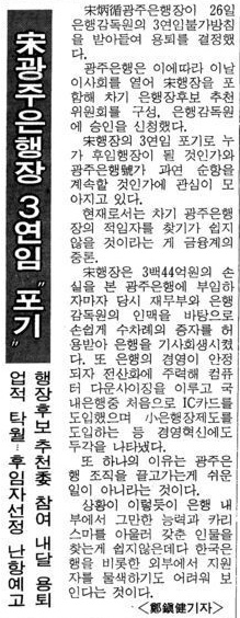 ³»°¡ ±¤ÁÖÀºÇàÀ» ±×¸¸µÑ ¹«·Æ¿¡ ±¤ÁÖÀºÇà °æ¿µ°æÁ¦¿¬±¸¼ÒÀÇ ¼ÒÀåÀº È«¸íÀç(ûóÙ¥î¦) ¾¾¿´´Ù. ±×´Â µþºÎÀÚ¿´´Âµ¥, ¸ðµÎ ¿ì¼öÇÑ ÀÚ³àµéÀ̾ú´Ù. ±×´Â ¾÷¹«¿¡ ´ëÇØ ¶Ù¾î³ ´É·Â°ú ÀÚÁúÀ» °¡Áö°í ÀÖ´Â ºÐÀ̾ú°í, ÀÔÇà ÈÄ¿¡µµ ²÷ÀÓ¾ø´Â ÀÚ±â°è¹ß·Î ´ëÇпø±îÁö ¸¶Ä£ ºÐÀ̾ú´Ù. ±×·¯³ª ºÒÇàÇϰԵµ ÀÔÇà ´ç½ÃÀÇ ÇзÂÀÌ Ç×»ó ±×ÀÇ ±æÀ» °¡·Î¸·¾Ò´Ù. ±×¸¦ ÀÌ»ç·Î ¹ßŹÇÏ°í ½ÍÀºµ¥ ¾î¾ ÀÏÀÎÁö ´ëÁÖÁÖµéÀÌ ¹Ý´ë¸¦ ÇÏ´Â °ÍÀ̾ú´Ù. ±×·¡¼ ³ª´Â ±×¸¦ ¿¬±¸¼ÒÀåÀ¸·Î ÀÓ¸íÇß´ø °ÍÀÌ´Ù.